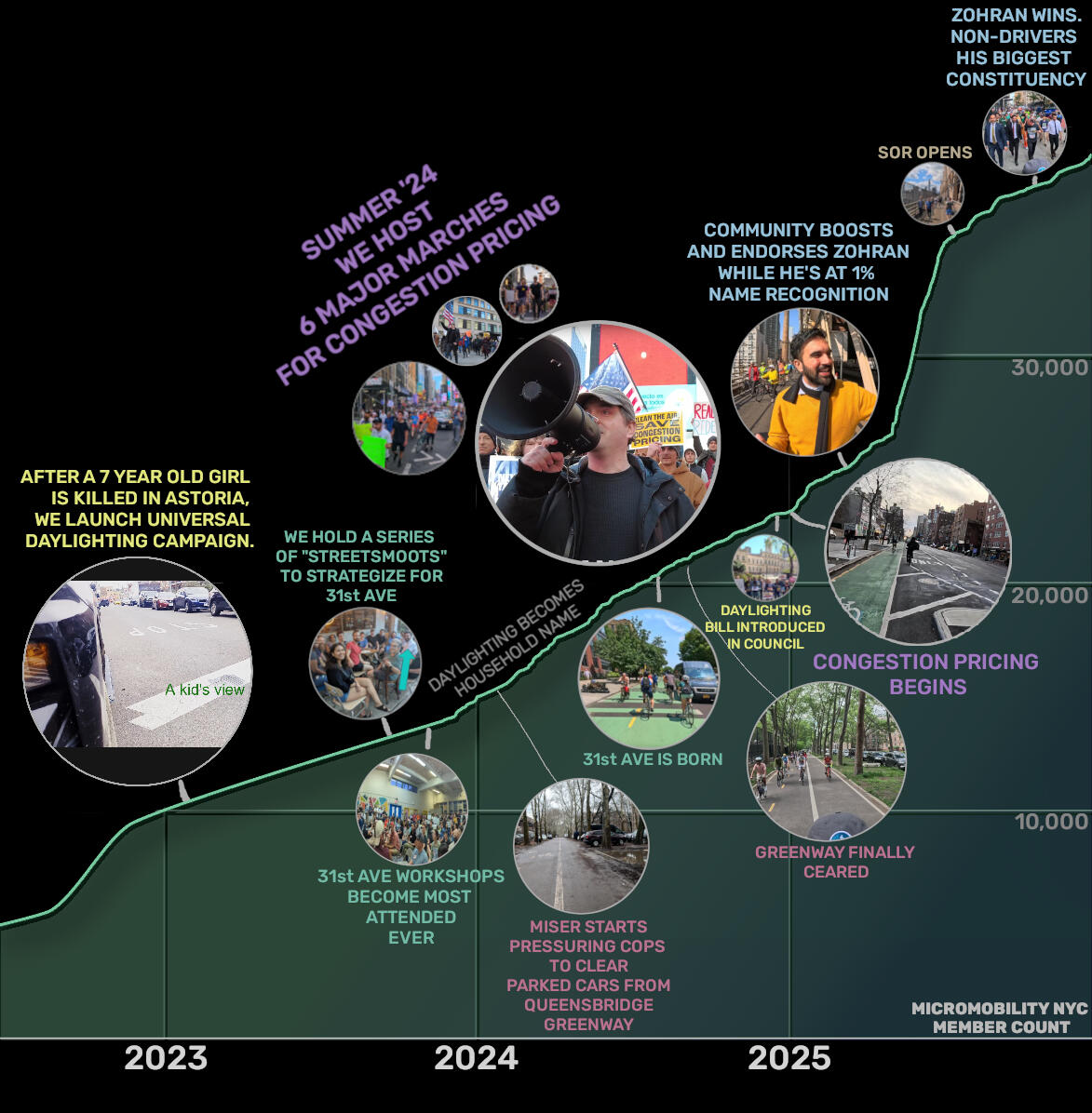 2025 has been another eventful year in the fight for better streets in New York City. We replaced our Mayor with a supportive one, and congestion pricing finally started.However, rising bike backlash combined with a culture war coming from Washington that targeted everything that might provide an alternative to the dominance of cars and the oil industry threatened multiple projects.